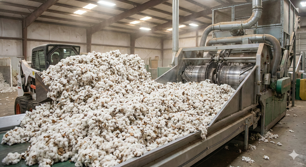 Harvested Raw Cotton have seeds and leaves is Transported to Gin. Ginning Machine separates Raw Fiber and Stores.