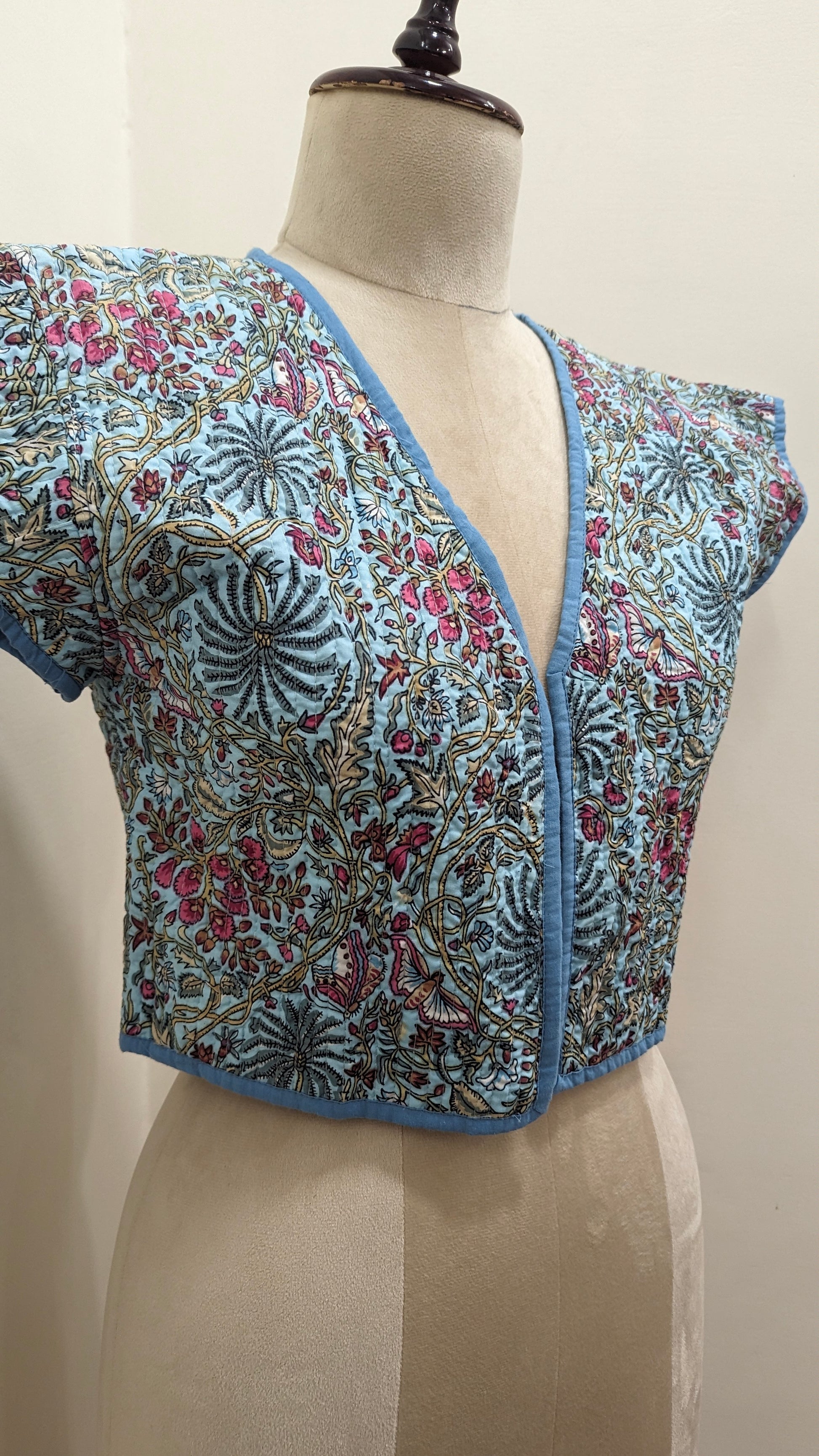 Embrace timeless artistry with this handcrafted Kalamkari quilted jacket, where traditional block-printed florals and delicate creeper motifs dance across pure cotton fabric.